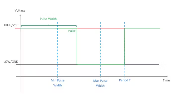 輸入是由信號(hào)在T期間被設(shè)置為高(脈沖寬度)的時(shí)間長(zhǎng)短來接收的,通常在電機(jī)特定范圍內(nèi)。調(diào)制(改變)脈沖寬度將改變你的電機(jī)輸出。