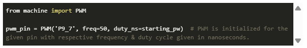 首先,您需要從機(jī)器庫(kù)中導(dǎo)入PWM庫(kù)。然后,通過聲明引腳(本例中為引腳9.7)、設(shè)置PWM頻率并初始化脈沖寬度,將引腳設(shè)置為PWM引腳。starting_pw將在后面根據(jù)我們使用的電機(jī)來定義。