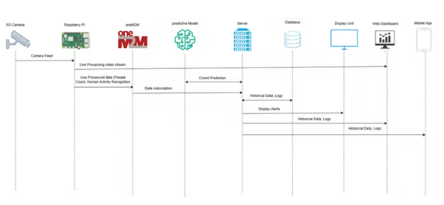 該系統(tǒng)通過5G攝像頭和物聯(lián)網(wǎng)傳感器持續(xù)監(jiān)控室內(nèi)或室外區(qū)域。邊緣的人工智能可以識別人群密度、不尋常的人類活動以及空氣質(zhì)量差等環(huán)境風險。這些洞察通過oneM2M中間件安全流動,從而確?;ゲ僮餍院蛯崟r事件交付。