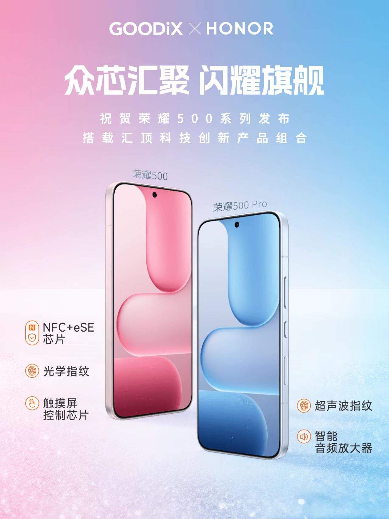 值得一提的是,榮耀500系列在關(guān)鍵人機(jī)交互與安全模塊上深度整合了匯頂科技的多項(xiàng)核心方案,包括超聲波/光學(xué)指紋識(shí)別、智能音頻放大器、高精度觸控以及NFC+eSE組合方案,共同構(gòu)建更流暢、安全且沉浸的旗艦級(jí)體驗(yàn)。