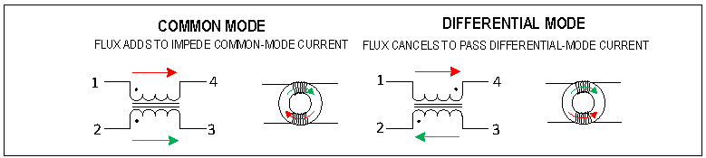 差模配置會(huì)阻礙差模信號(hào)通過,但允許共模信號(hào)通過。對(duì)于差模信號(hào),磁通沿相反方向通過電感,相互抵消,因此允許差分信號(hào)通過扼流圈。
