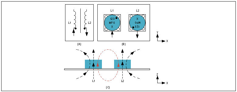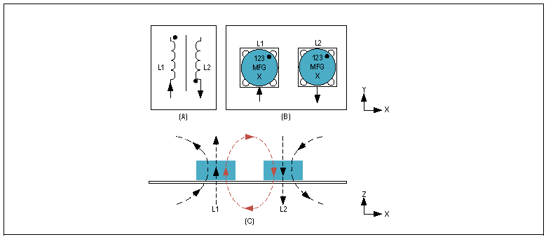 圖8.兩個(gè)獨(dú)立電感的組合及其配置圖示:(A)差模連接,(B)PCB上,(C)差模信號(hào)通過時(shí)的磁場(chǎng)