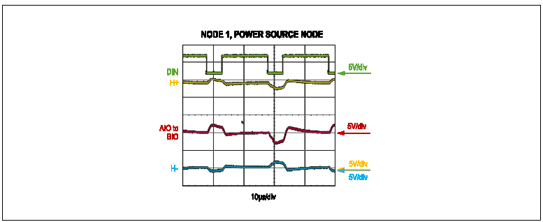 總線上的總阻抗ZBUS = ZNODE1 || ZNODE2 || ZNODE3 || ZNODE4 || ZNODE5 || ZNODE6 || ZNODE7 || ZNODE8 = 183Ω || (15kΩ / 5) || 4kΩ || 3.3kΩ = 157Ω,大于所需的最小總線端接電阻100Ω。圖16顯示了節(jié)點(diǎn)1(供電節(jié)點(diǎn))處的總線波形。