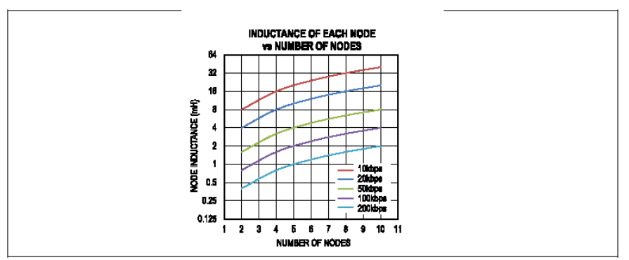 請(qǐng)注意,由于MAX22088有源電路的實(shí)現(xiàn)方式,MAX22088的瞬態(tài)響應(yīng)與標(biāo)準(zhǔn)差模電感不同。此外,為了支持動(dòng)態(tài)電纜端接,建議增加電感值,以補(bǔ)償連接動(dòng)態(tài)端接的情況下總線上阻抗的突然損失。欲了解更多信息,請(qǐng)參閱MAX22088數(shù)據(jù)手冊(cè)中的“動(dòng)態(tài)電纜端接”部分。在有多個(gè)連接節(jié)點(diǎn)的更復(fù)雜系統(tǒng)中,電感值會(huì)發(fā)生變化。針對(duì)不同節(jié)點(diǎn)數(shù)的多節(jié)點(diǎn)配置中的每個(gè)節(jié)點(diǎn),圖5提供了所需總線電感的估計(jì)值。