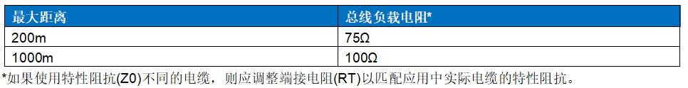Home Bus標(biāo)準(zhǔn)規(guī)定了不同通信距離對(duì)應(yīng)的總線負(fù)載電阻,如表1所示??偩€負(fù)載電阻是雙線總線上維持所有驅(qū)動(dòng)器和接收器的最小差模電壓所必需的最小電阻(最大負(fù)載)。在實(shí)際應(yīng)用中,負(fù)載電阻很大程度上由收發(fā)器處的端接電阻(RT)決定。為了在總線上獲得理想信號(hào)質(zhì)量,端接電阻應(yīng)與電纜的特性阻抗(Z0)相匹配。