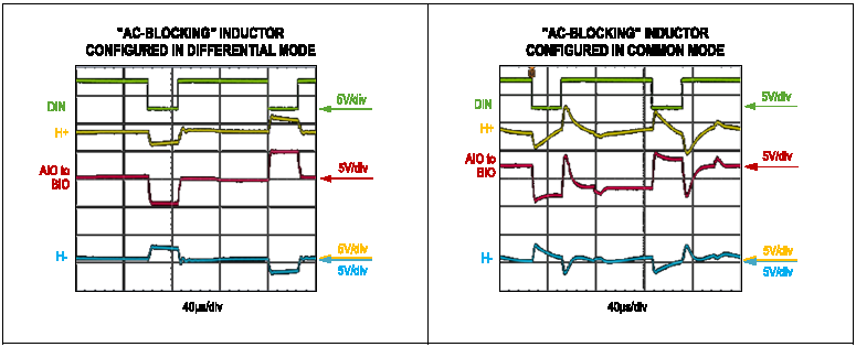 圖7顯示,當(dāng)供電節(jié)點(diǎn)中的電感對(duì)(圖3中L1)配置為差模時(shí),通信正常(左),但當(dāng)該電感對(duì)配置為共模時(shí),波形異常(右)。
