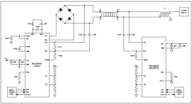 MAX22288收發(fā)器專為PoD系統(tǒng)中的供電節(jié)點(diǎn)而設(shè)計(jì),供電節(jié)點(diǎn)需要外部“交流阻斷”電感來供電。MAX22088收發(fā)器則集成了“交流阻斷”電感,因而能夠在PoD系統(tǒng)中的受電節(jié)點(diǎn)上使用,無需外部“交流阻斷”電感。