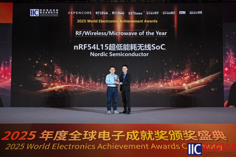 挪威奧斯陸 – 2025年11月26日 – 在由全球電子技術(shù)領(lǐng)域知名媒體集團(tuán) AspenCore 主辦的 “國際集成電路展覽會暨研討會”(IIC Shenzhen 2025)頒獎(jiǎng)盛典上,Nordic Semiconductor 旗下 nRF54L15 超低功耗無線系統(tǒng)級芯片(SoC)憑借在射頻技術(shù)創(chuàng)新、多協(xié)議兼容性及超低功耗表現(xiàn)上的卓越實(shí)力,榮膺 “全球電子成就獎(jiǎng)”(World Electronics Achievement Awards)之 “年度射頻 / 無線 / 微波產(chǎn)品獎(jiǎng)”。該獎(jiǎng)項(xiàng)由 AspenCore 全球資深產(chǎn)業(yè)分析師評審委員會及亞、美、歐洲地區(qū)網(wǎng)站用戶群共同評選,是電子產(chǎn)業(yè)領(lǐng)域極具權(quán)威性的榮譽(yù),充分印證了 nRF54L15 在推動(dòng)全球無線通信技術(shù)創(chuàng)新與物聯(lián)網(wǎng)產(chǎn)業(yè)發(fā)展中的領(lǐng)先地位。