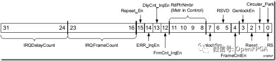 顧名思義,該寄存器用于控制VDMA,具體可以實(shí)現(xiàn)復(fù)位、使能鎖相同步、設(shè)定幀存切換模式、啟動VDMA讀寫通道等操作。每一位作用如下圖所示,低4位是最重要的,接下來會詳細(xì)介紹。