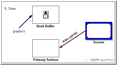 如上圖所示,此時由于處于初始狀態(tài),畫圖操作的結(jié)果都在后緩沖區(qū)中,而屏幕上顯示的則是前緩沖區(qū)中的內(nèi)容。此時畫圖操作尚未完成,畫圖操作完成之后,頁轉(zhuǎn)換操作開始執(zhí)行,示意圖如下圖所示: