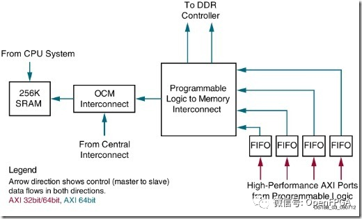 Zynq共有四個AXI_HP通道,通道數(shù)據(jù)寬度可以配置為32位或64位,這些接口通過FIFO控制器連接PL到存儲接口上,其中有兩條連接到DDR存儲控制器上,還有一條是連接到雙端口的OCM上的,下圖是AXI_HP訪問DDR和OCM的連接圖。