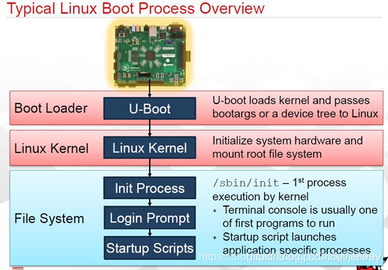 移植操作系統(tǒng)后zynq的啟動過程如下,首先加載bootrom(zynq中自帶,用戶無法修改),然后執(zhí)行fsbl(這個根據(jù)硬件在sdk中創(chuàng)建),然后執(zhí)行uboot,uboot會將kernel、devicetree和ramdisk載入ddr,跳轉(zhuǎn)到內(nèi)核入口處執(zhí)行,這樣linux就啟動了