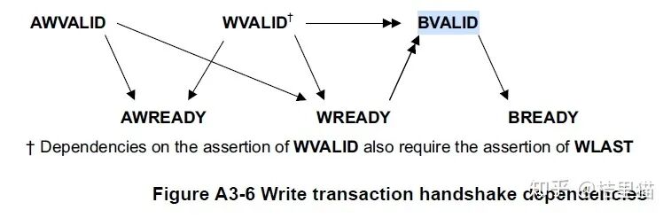 寫(xiě)也類似。如上圖。上面一行是主設(shè)備。下面一行是從設(shè)備。其中BVALID就是response通道的valid. 其他應(yīng)該不難看懂。前面的差不多。就是多了個(gè)bvalid. 主設(shè)備只有檢測(cè)到wvalid, wready 同時(shí)為高,且數(shù)據(jù)傳輸完成了,就把bvalid給置高。