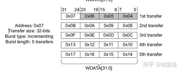比如上面這個(gè)例子。32bit的地址總線。burst size給了個(gè)8bit. 那就靠WSTRB這個(gè)信號(hào)確定往哪兒寫(xiě)。比如上面。傳輸了5次。可以控制數(shù)據(jù)往不同地方寫(xiě)。
