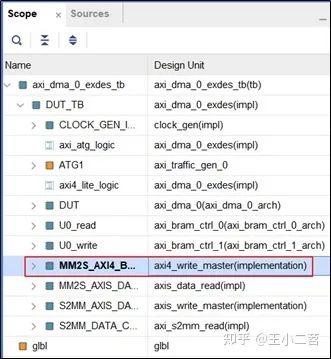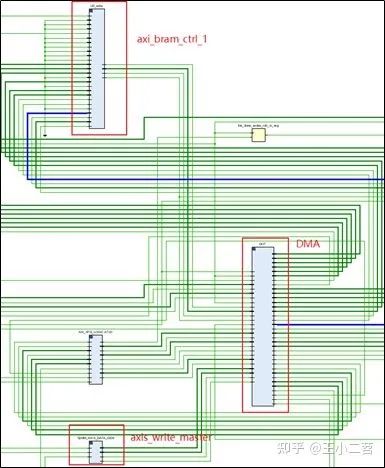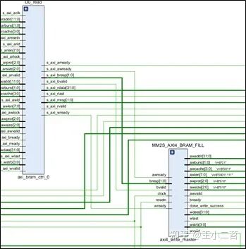 MM2S通道操作完成后,再來分析S2MM通道,當(dāng)S2MM通道對應(yīng)的寄存器配置完成后,axis_write_master通過DMA向axi_bram_ctrl_1寫入數(shù)據(jù),RTL連接圖如下: