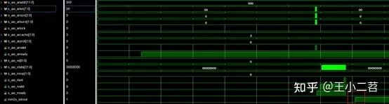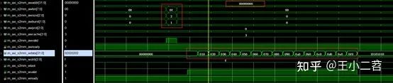 從波形可知,寫數(shù)據(jù)分為兩次進(jìn)行,第一次地址為0x00_00_00_00,第二次地址為0x00_00_00_80,突發(fā)length均為0x1f,突發(fā)size為2,突發(fā)類型為INCR,即一次寫操作寫入128字節(jié)的數(shù)據(jù)。關(guān)于AXI4的突發(fā)操作,可以參考如下文章: