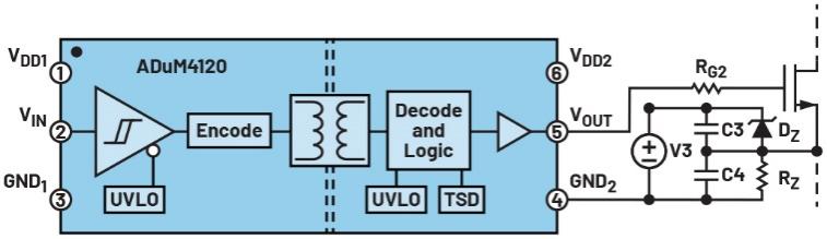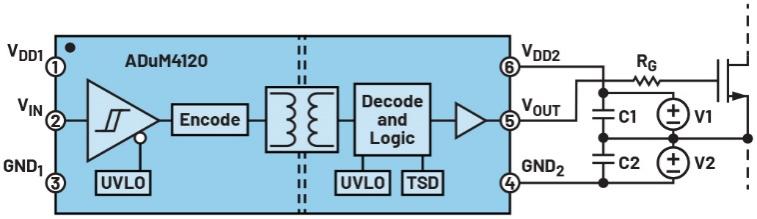 其中一個例子是使用隔離式驅(qū)動器ADuM4120。在這類應(yīng)用中,功率器件由正電壓(如V1)和負(fù)電壓(如V2)驅(qū)動,如圖1所示。