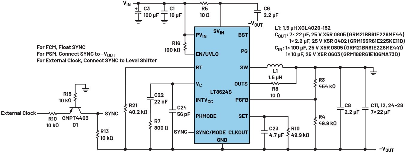 當(dāng)?shù)湫偷耐浇祲恨D(zhuǎn)換器的輸出側(cè)與電路接地進(jìn)行切換時,就會產(chǎn)生一個反相降壓-升壓(IBB)轉(zhuǎn)換器,如圖6所示。這種方法很受歡迎,因為市面上有許多可供選擇的同步降壓穩(wěn)壓器或控制器。對于噪聲敏感型應(yīng)用,ADI的Silent Switcher®單片降壓穩(wěn)壓器,例如采用Silent Switcher 3技術(shù)的LT8624S,可配置為IBB以產(chǎn)生具有出色的寬帶和EMI噪聲性能的負(fù)電壓軌。圖6顯示了將LT8624S用作IBB的轉(zhuǎn)換器的一個示例電路,詳見“針對噪聲敏感型應(yīng)用的快速瞬變負(fù)電壓軌”這篇文章。為了進(jìn)行進(jìn)一步的濾波處理,可以在輸出端添加一個低噪聲的負(fù)輸入LDO穩(wěn)壓器。如果在使用這種拓?fù)浣Y(jié)構(gòu)時需要更高的功率,ADI公司有多種同步降壓控制器可供選擇,并且可以搭配外部FET使用。