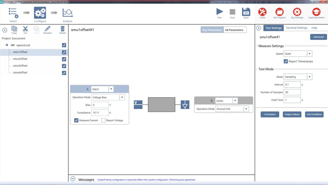 測量帶有4200-PA前置放大器的每個4200-SMU的偏置時,除了金屬帽外,F(xiàn)orce HI和Sense HI端子沒有任何連接。這些金屬帽包含在系統(tǒng)備件中。在進行任何測量之前,應(yīng)將前置放大器連接到SMU上,并前置放大器的Force HI和Sense HI端子接上金屬帽,對SMU預(yù)熱至少一小時。偏置電流可以使用“Low Current Project”項目來測量,該項目可以在項目庫的選擇視圖中找到,或直接搜索“Low Current”獲取。圖2顯示了Clarius軟件應(yīng)用程序中的這個項目。