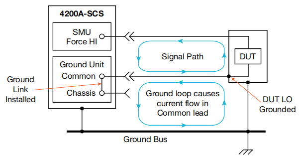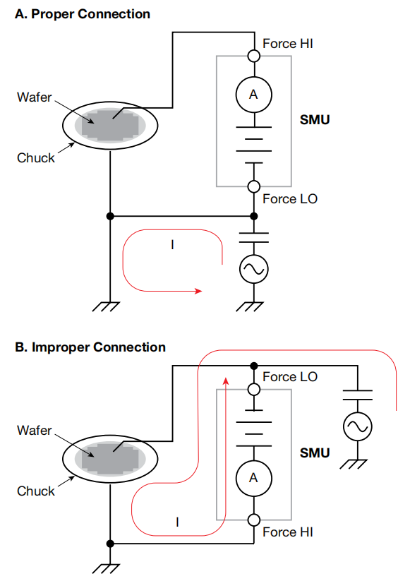 除了在連接DUT時使用屏蔽和Guard外,4200A-SCS與設(shè)備的接入位置也是非常重要的。SMU Force Hl和Force Lo端子連接不當(dāng)會導(dǎo)致電流偏移,測量結(jié)果不穩(wěn)定。這些誤差是由共模電流引起的。