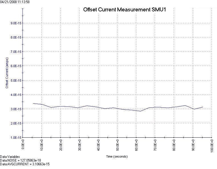 打開這個項目,選擇SMU1offset測試項,測量SMU1的偏置電流。選擇Analyze,然后運行測試。結(jié)果應(yīng)該類似于圖3所示的圖形??赡苄枰褂米詣涌s放功能來適當(dāng)?shù)乜s放曲線。右鍵單擊圖形可以找到自動縮放功能。當(dāng)4200-PA前置放大器連接到SMU時,偏置電流應(yīng)該在fA量級內(nèi)。偏置電流可以是正的,也可以是負的??捎肧MU標的的電流表規(guī)格來驗證這些結(jié)果。應(yīng)該重復(fù)此操作對系統(tǒng)中的每個SMU進行單獨的測量。Low Current Project會對四個帶前置放大器的SMU進行偏置電流測量的測試。