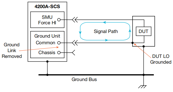 為了防止接地回路,測試系統(tǒng)應(yīng)該只在一個點接地。如果不能拆除DUT接地,則應(yīng)拆除4200A-SCS GNDU公共端子與機箱接地之間的接地鏈路,如圖19所示。