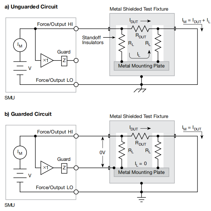 Guard不應(yīng)與屏蔽混淆。屏蔽通常意味著使用金屬外殼來防止靜電干擾影響高阻抗測試電路。Guard意味著使用一個附加的低阻抗導(dǎo)體,與高阻抗電路保持相同的電位,它將攔截任何干擾電壓或電流。Guard并不一定提供屏蔽。下面的段落概述了兩個Guard的例子:1)使用Guard來減少由于測試夾具造成的泄漏;2)使用Guard來減少由于布線造成的泄漏電流。