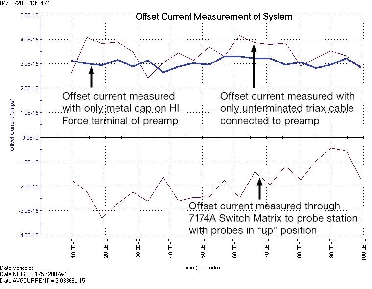 圖4顯示了:1)僅接入force HI端子的SMU的偏移量;2)前置放大器上僅帶三軸電纜;3)通過Keithley 7174A低電流開關(guān)矩陣到探針臺上處于“UP”位置的探頭。