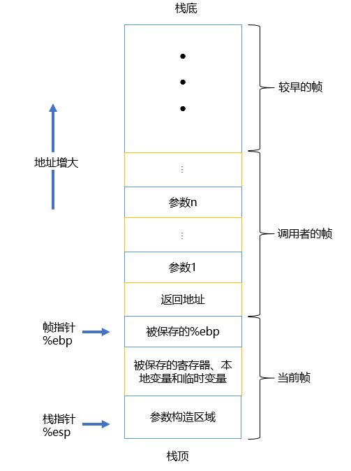 為單個函數(shù)調(diào)用分配的那部分棧稱為棧幀,棧幀的邊界由兩個指針界定:寄存器%ebp為幀指針,指向當(dāng)前棧幀的起始處,通常較為固定;寄存器%esp為棧指針,指向當(dāng)前棧幀的棧頂位置,當(dāng)程序執(zhí)行時,棧指針可以移動,因此大多數(shù)數(shù)據(jù)的訪問都是相對于幀指針的。