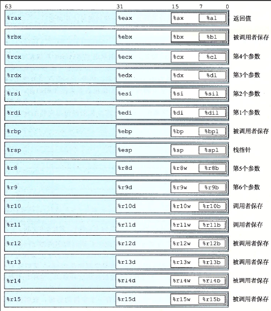 上圖表達(dá)的應(yīng)該已經(jīng)很清楚啦,簡單示例解釋一下,函數(shù)調(diào)用需要傳遞參數(shù)時,第一個參數(shù)存到%edi里,第二個參數(shù)會存到%esi里,如果有返回值會存到%eax里,這里如果是64位的返回值,會使用%rax。