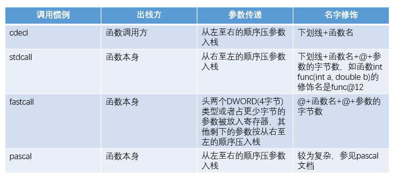 名字修飾策略:為了鏈接的時候?qū)φ{(diào)用約定進(jìn)行區(qū)分,需要對函數(shù)本身的名字進(jìn)行修飾,不同的調(diào)用約定有不同的名字修飾策略。一般都是前面加個下劃線。