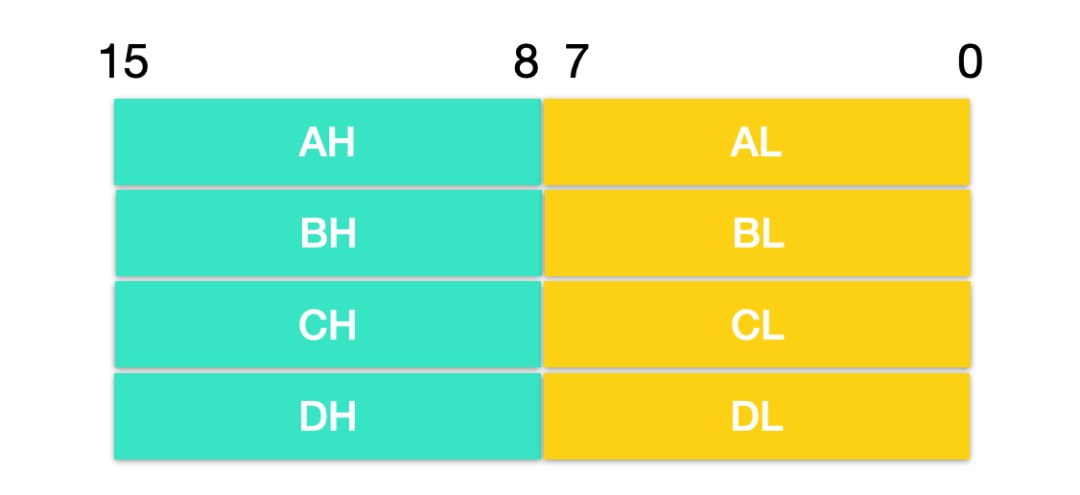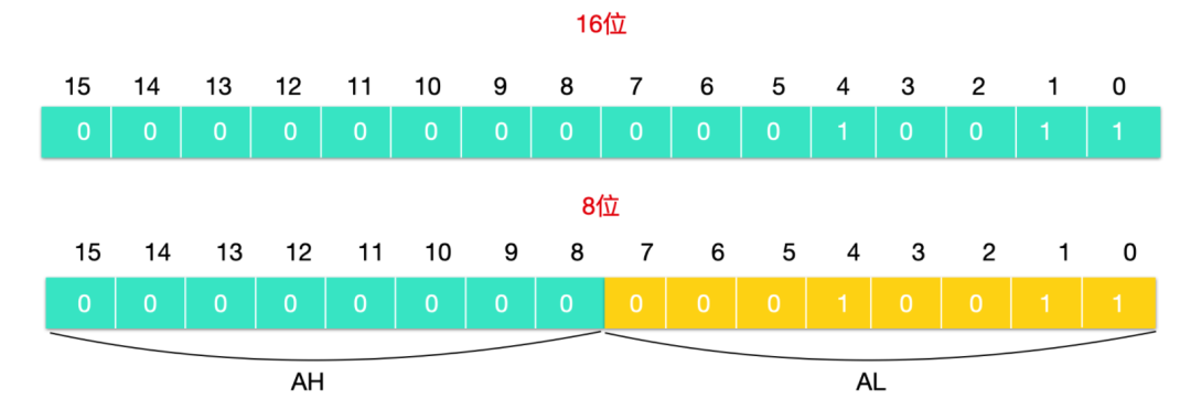 AX 的低位(0 - 7)位構(gòu)成了 AL 寄存器,高 8 位(8 - 15)位構(gòu)成了 AH 寄存器。AH 和 AL 寄存器是可以使用的 8 位寄存器,其他同理。