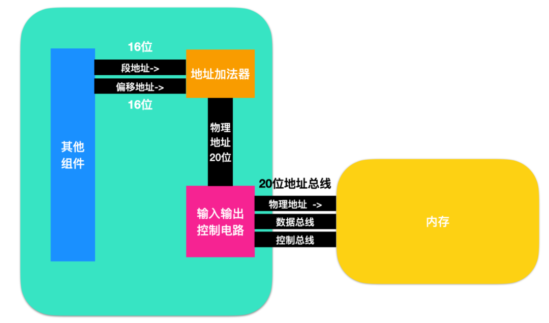 CPU 相關(guān)組件提供兩個地址:段地址和偏移地址,這兩個地址都是 16 位的,他們經(jīng)由地址加法器變?yōu)?20 位的物理地址,這個地址即是輸入輸出控制電路傳遞給內(nèi)存的物理地址,由此完成物理地址的轉(zhuǎn)換。