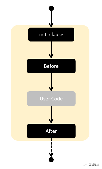 圖中灰色的部分為原本實際的執(zhí)行流程,而純黑色的線條以及最下方的虛線箭頭則為等效的運行流程。與do {} while(0) 相比,在我們眼中 for 循環(huán)的幾個關鍵部分就有了新的意義: