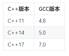 - C++標(biāo)準(zhǔn)與相應(yīng)的GCC版本要求如下: