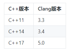 - C++標(biāo)準(zhǔn)與相應(yīng)的Clang版本要求如下: