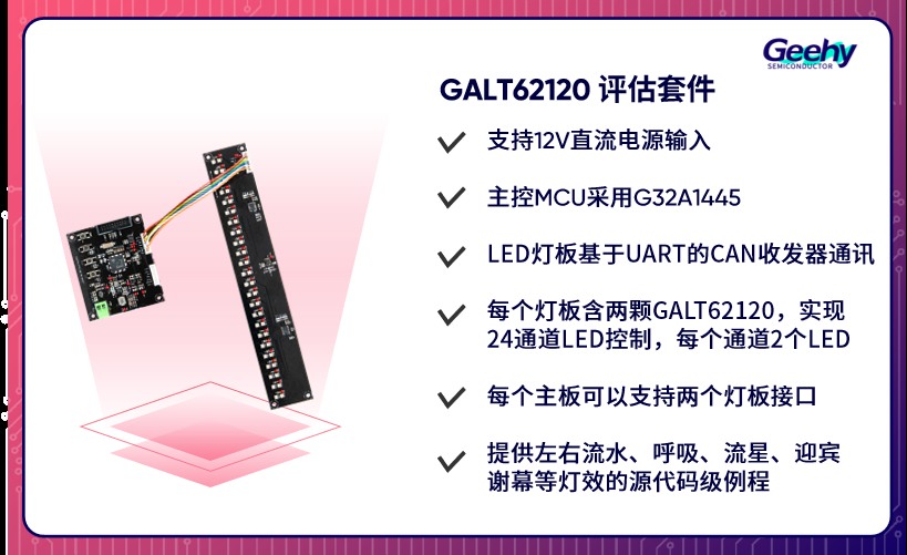 極海GALT62120汽車高邊LED驅(qū)動器,支持12通道精密高邊電流輸出,可提供像素級LED獨立控制;集成可編程12位PWM調(diào)光,實現(xiàn)線性和指數(shù)調(diào)光;支持LED開路/短路檢測、過溫保護等功能,符合AEC-Q100 Grade1標準,可適用于汽車貫穿式/圖形化尾燈、前照燈、動態(tài)流水燈、迎賓燈、轉(zhuǎn)向燈、儀表顯示燈以及內(nèi)環(huán)境燈等車燈應(yīng)用中。