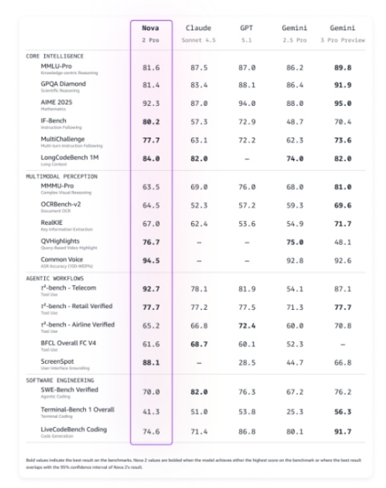 Nova 2 Pro是亞馬遜最智能的推理模型,能夠處理文本、圖像、視頻和語音輸入,并生成文本輸出。它非常適合用于需要最高準確率的高度復雜任務,如Agent編程(agentic coding)、長期規(guī)劃以及復雜問題求解。該模型還可以作為“教師模型”,通過知識蒸餾將自身能力遷移到更小、更高效的“學生模型”上,用于特定垂直領域和應用場景。在公開基準測試中,Nova 2 Pro表現(xiàn)出色:與Claude Sonnet 4.5對比,在16項評測中有10項持平或更優(yōu);與GPT-5.1的16項評測中有8項持平或更優(yōu);與Gemini 2.5 Pro的19項評測中有15項持平或更優(yōu);與Gemini 3 Pro Preview的18項評測中有8項持平或更優(yōu)。Nova 2 Pro在多文檔分析、視頻推理、復雜指令執(zhí)行、高階數(shù)學問題求解,以及執(zhí)行Agent與軟件工程任務等方面表現(xiàn)出眾。