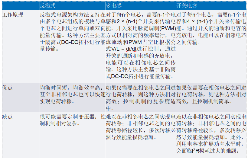 表1.三種主動(dòng)均衡解決方案的工作原理和優(yōu)缺點(diǎn)比較