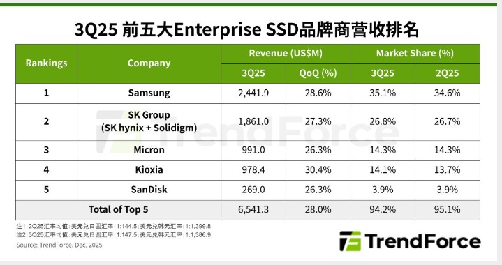 TrendForce集邦咨詢: 2025年第三季度企業(yè)級 SSD價(jià)量齊升,產(chǎn)業(yè)營收季增28%