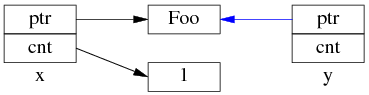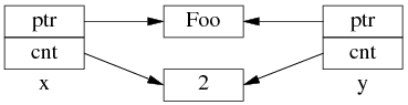 如果再執(zhí)行 shared_ptry = x; 那么對(duì)應(yīng)的數(shù)據(jù)結(jié)構(gòu)如下。
