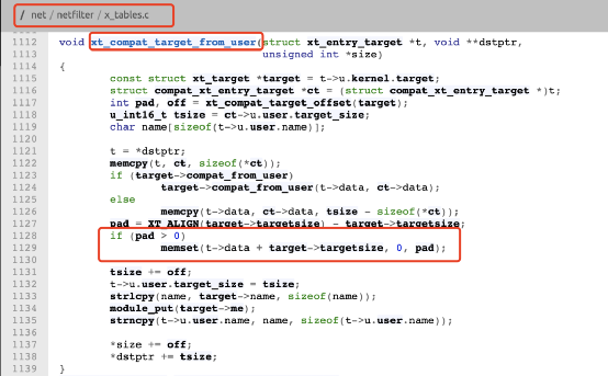 在Linux內核代碼net/netfilter/x_tables.c中的 xt_compat_target_from_user 函數(shù)內的第1129行,在使用memset()時并未對傳進來的參數(shù)進行校驗,會導致在寫0時,越過堆的大小,導致“堆溢出”,從而破壞堆與堆之間的邊界。