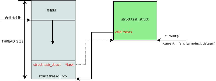 register unsigned long current_stack_pointer asm ("sp"); static inline struct thread_info *current_thread_info(void) { return (struct thread_info *) (current_stack_pointer & ~(THREAD_SIZE - 1)); } #define get_current() (current_thread_info()->task) #define current get_current()