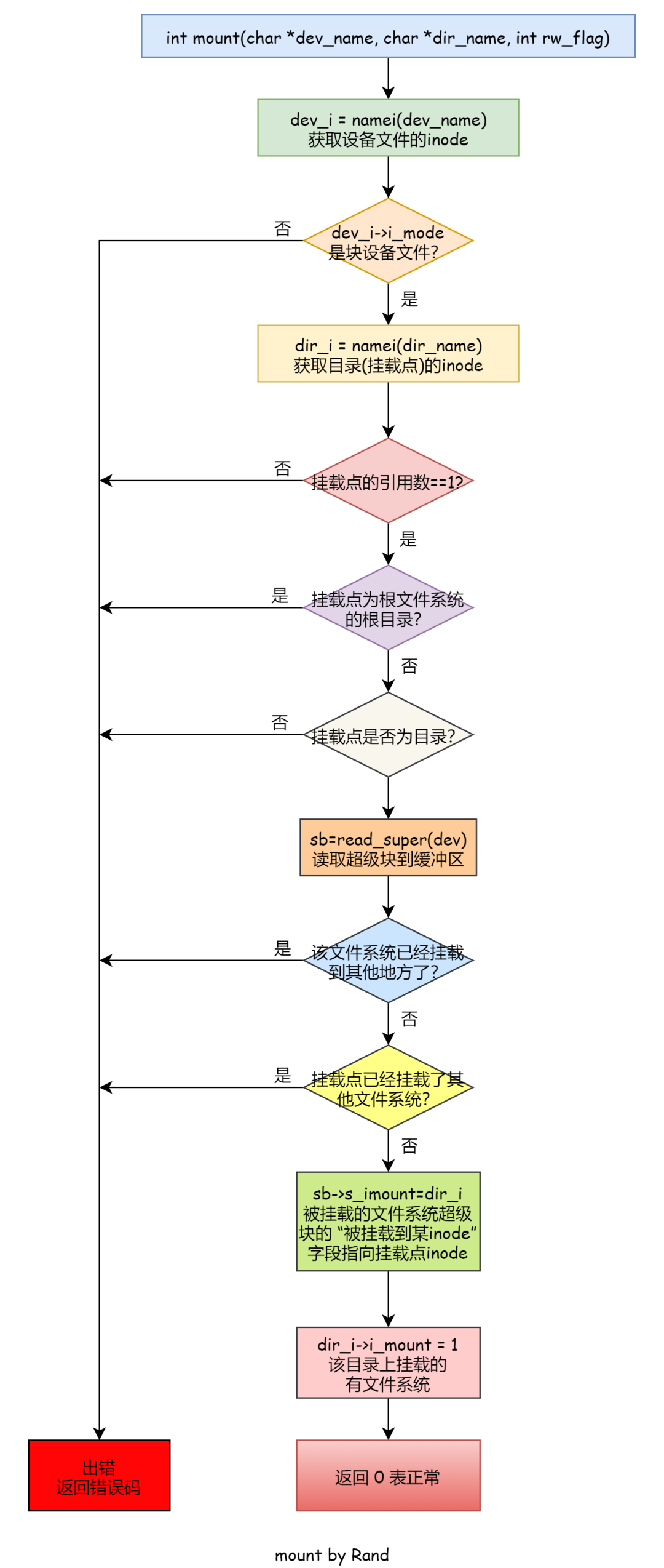 int sys_mount(char * dev_name, char * dir_name, int rw_flag) //將名稱為dev_name的設(shè)備上的文件系統(tǒng)掛載到目錄dir_name上 { struct m_inode * dev_i, * dir_i; struct super_block * sb; int dev; if (!(dev_i=namei(dev_name))) //沒有找到該設(shè)備 return -ENOENT; dev = dev_i->i_zone[0]; if (!S_ISBLK(dev_i->i_mode)) { //不是塊設(shè)備 iput(dev_i); return -EPERM; } iput(dev_i); //釋放該設(shè)備的inode if (!(dir_i=namei(dir_name))) //解析獲取掛載點(diǎn)的inode return -ENOENT; if (dir_i->i_count != 1 || dir_i->i_num == ROOT_INO) { //如果掛載點(diǎn)的引用數(shù)不等于1獲取掛載點(diǎn)為根目錄 iput(dir_i); return -EBUSY; } if (!S_ISDIR(dir_i->i_mode)) { //掛載點(diǎn)不是目錄 iput(dir_i); return -EPERM; } if (!(sb=read_super(dev))) { //將設(shè)備上的文件系統(tǒng)的超級(jí)塊讀取到內(nèi)存中 iput(dir_i); return -EBUSY; } if (sb->s_imount) { //如果該文件系統(tǒng)已掛載 iput(dir_i); return -EBUSY; } if (dir_i->i_mount) { //如果掛載點(diǎn)已經(jīng)掛載了其他文件系統(tǒng) iput(dir_i); return -EPERM; } sb->s_imount=dir_i; //將掛載點(diǎn)的inode記錄到設(shè)備的超級(jí)塊中 dir_i->i_mount=1; //表示該掛載點(diǎn)已經(jīng)掛載了該文件系統(tǒng) dir_i->i_dirt=1; /* NOTE! we don't iput(dir_i) */ //我們不會(huì)釋放掛載點(diǎn)的inode return 0; /* we do that in umount */ //我們?cè)趗mount卸載文件系統(tǒng)時(shí)釋放 }