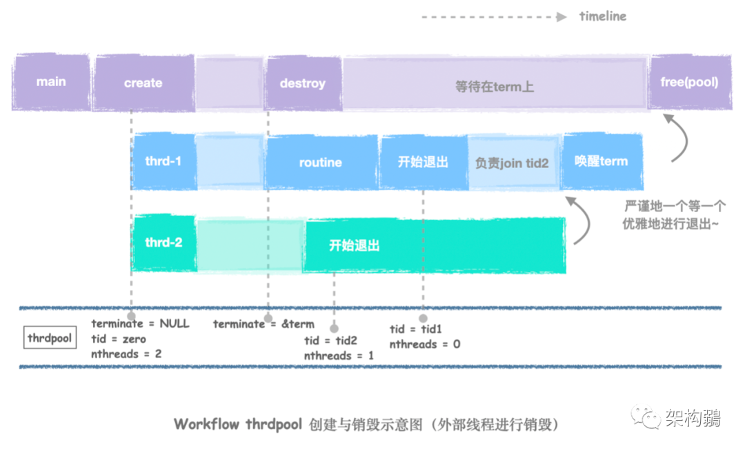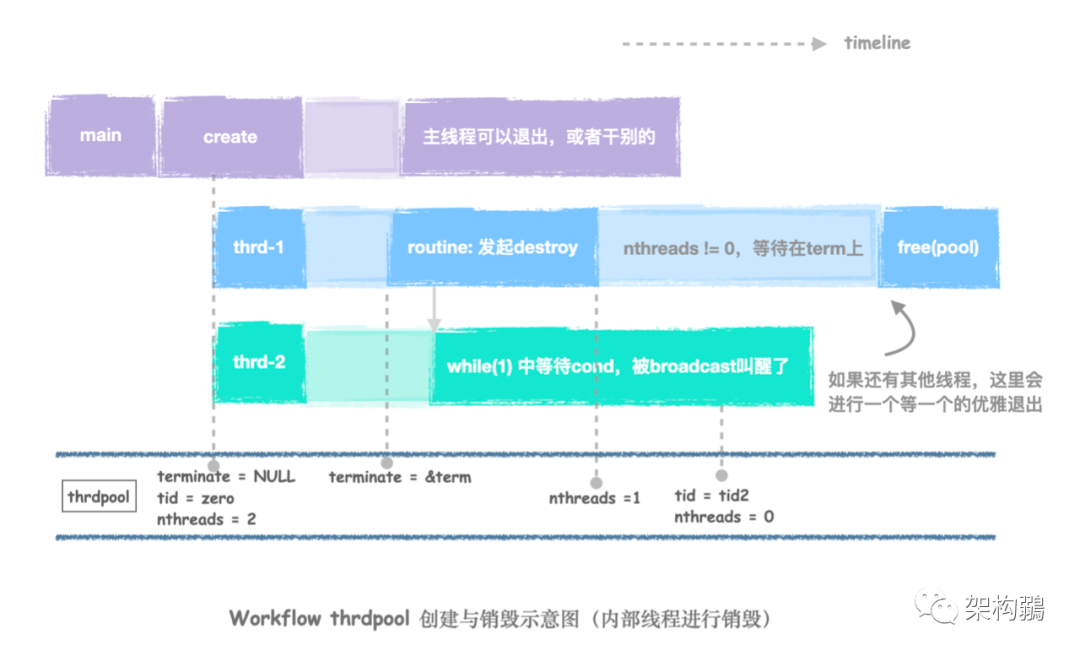 - 一個pthread_cond_t *terminate,這有兩個用途:不僅是退出時的標(biāo)記位 ,而且還是調(diào)用退出的那個人要等待的condition。
