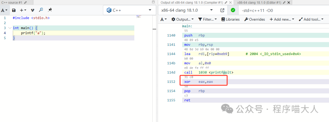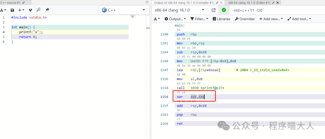 xor eax, eax,表示使用異或操作將eax寄存器的值清零。在x86-64架構中,main函數的返回值通常通過eax寄存器傳遞。因此,這行代碼表示main函數返回0。
