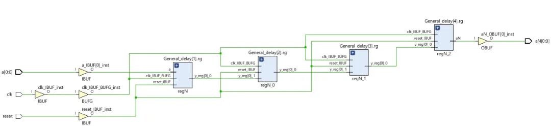 parameter D = 4)(clk,reset,a,aN); input clk,reset; input [N-1:0] a; output [N-1:0] aN; wire [N-1:0] tmp [D:0]; assign tmp[0] = a; generate genvar p; for (p = 1; p <= D; p = p+1) begin: General_delay regN #(N) rg(tmp[p],clk,reset,tmp[p-1]); end endgenerate assign aN = tmp[D]; endmodule