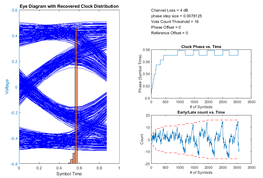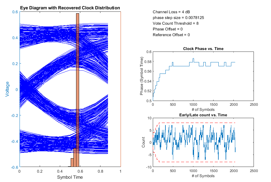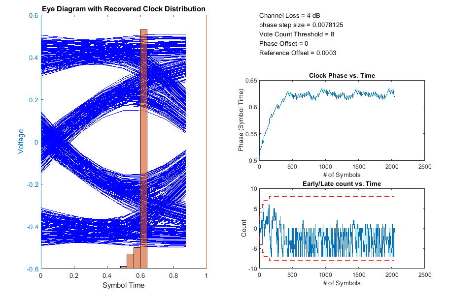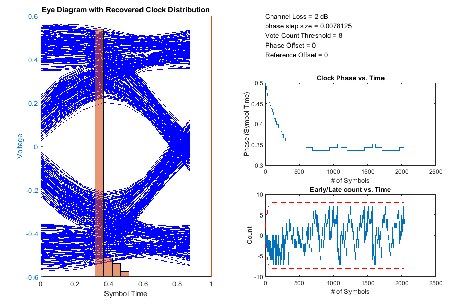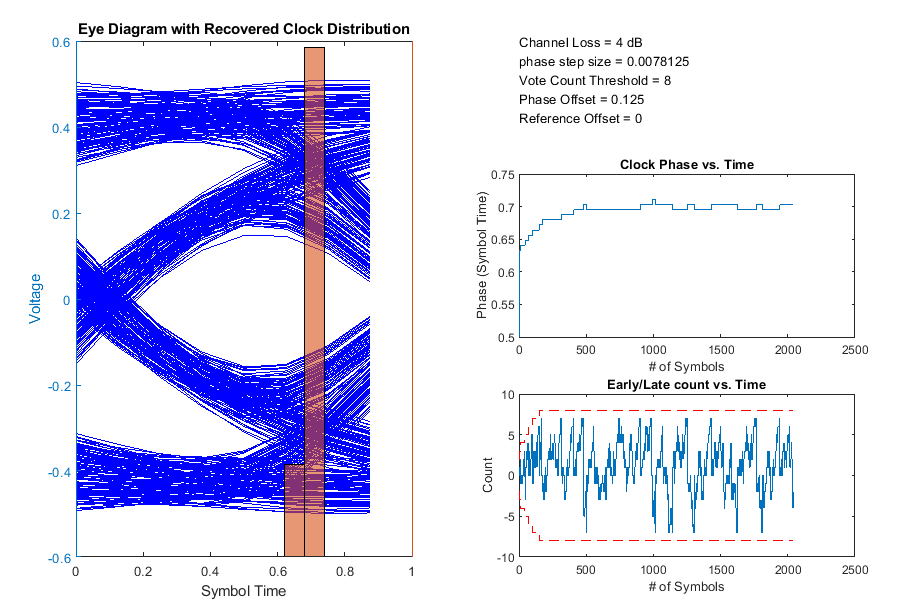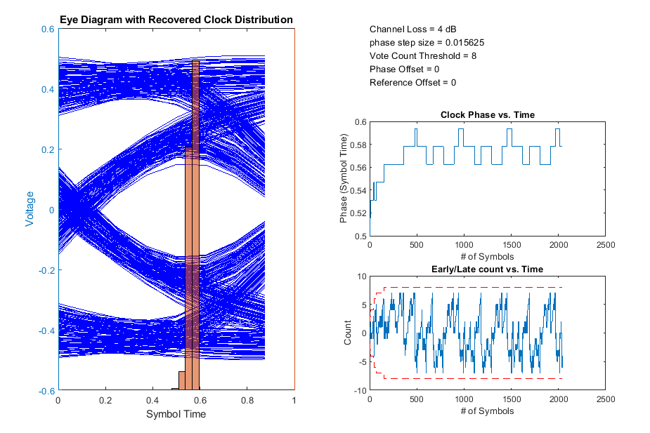 為了展示時鐘收斂到不同的相位,將信道損耗更改為2 dB?,F在,時鐘相位會適應到大約0.35個符號時間。