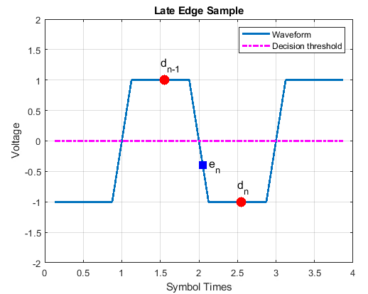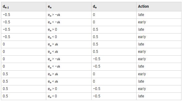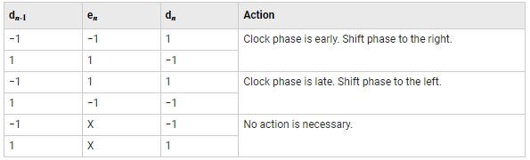 通過一些數字邏輯處理邊緣樣本(en)和數據樣本(dn-1 和 dn),以確定邊緣樣本(以及時鐘相位)是提前還是延遲。邊緣樣本en和數據樣本dn相隔半個符號時間。