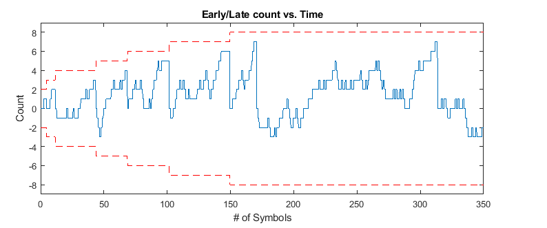 此圖顯示了早/晚計數(藍色)和閾值(紅色虛線)的前350個符號。在CDR模塊內部,投票會增加或減少,并與閾值進行比較,然后在必要時重置。下圖中顯示的外部投票值并未觸及閾值,但投票重置為0時則顯而易見。
